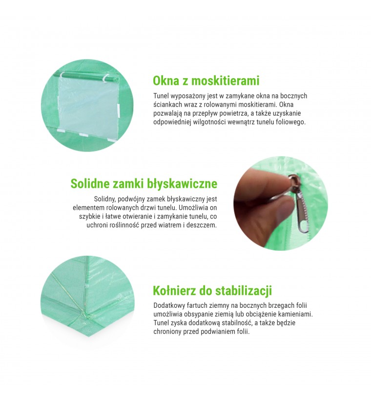 Folia posiada szerokie wejście z dwoma zamkami błyskawicznymi - drzwi można zrolować i przypiąć na górze zatrzaskami. Tunel wyposażony jest także w okna boczne z moskitierami, które chronią uprawy przed insektami i zapewniają wydajną wentylację. Odpowiednia wysokość tunelu zapewnia swobodę wykonywania prac w jego wnętrzu oraz swobodny wzrost roślin.
